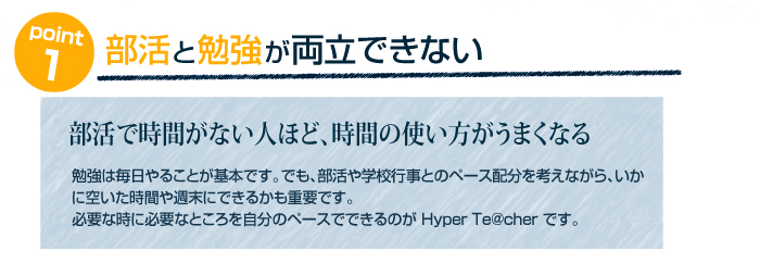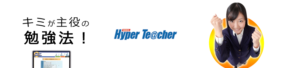 Hyper Te@cherは、学校の授業の進度に合わないとか、量を課すといった負担をともなう 勉強法ではありません。大手予備校のスーパー講師の質の高い解説を、基礎からわかりやすく、 授業に沿って受講する、忙しい現役生のための学習プログラムなのです。
